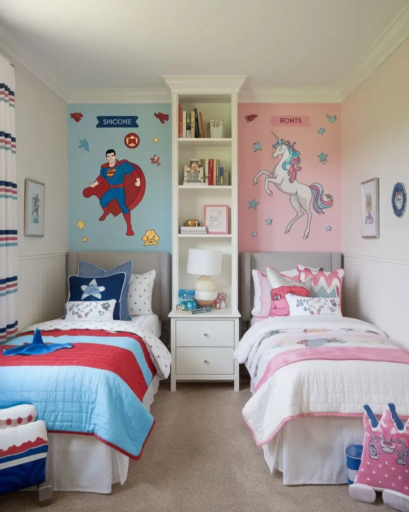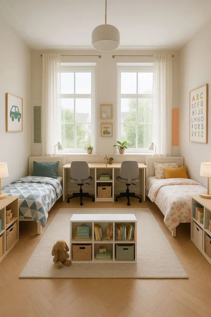 میتوانید برای هر کودک میز تحریر کوچکی در نظر بگیرید یا با نصب تابلوها و عکسهای جداگانه، مرزهای بصری ملایمی ایجاد کنید. پردههای سبک یا پارتیشنهای پارچهای نیز میتوانند بدون تقسیم فیزیکی، حس استقلال را منتقل کنند.