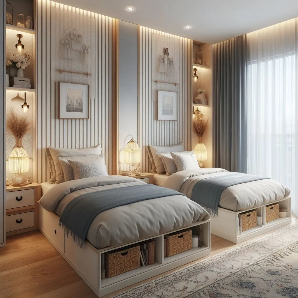 برای اتاق دوقلوها، بهترین انتخاب مبلمان چندکاره است. تختهایی با کشوهای زیرین، میزهای تحریر تاشو و کمدهای عمودی باعث میشوند فضای اتاق منظمتر و کاربردیتر باشد.