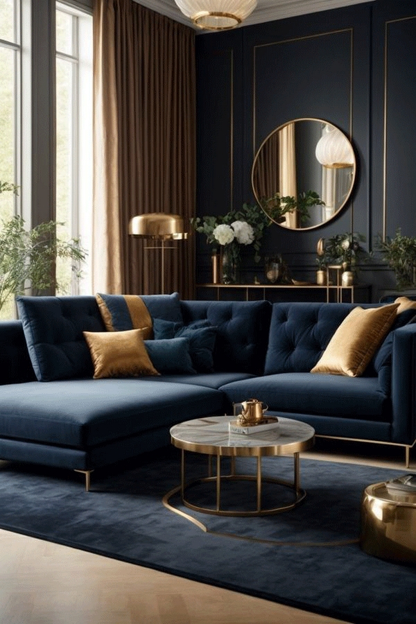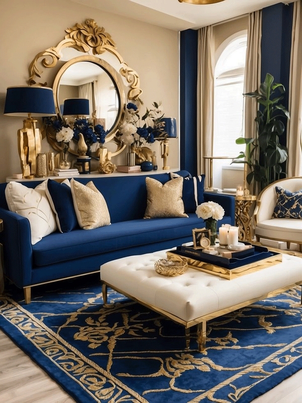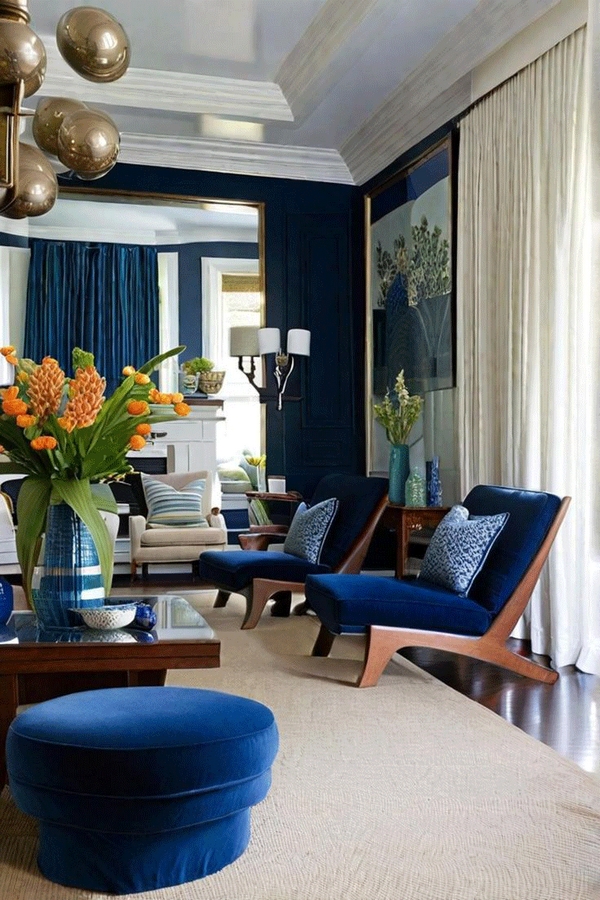 برای ایجاد حس گرما و صمیمیت بیشتر، میتوانید از پارچههای مبلمان یا پردههایی به رنگهای کرم، طلایی یا بژ در کنار دیوارهای آبی درباری استفاده کنید.