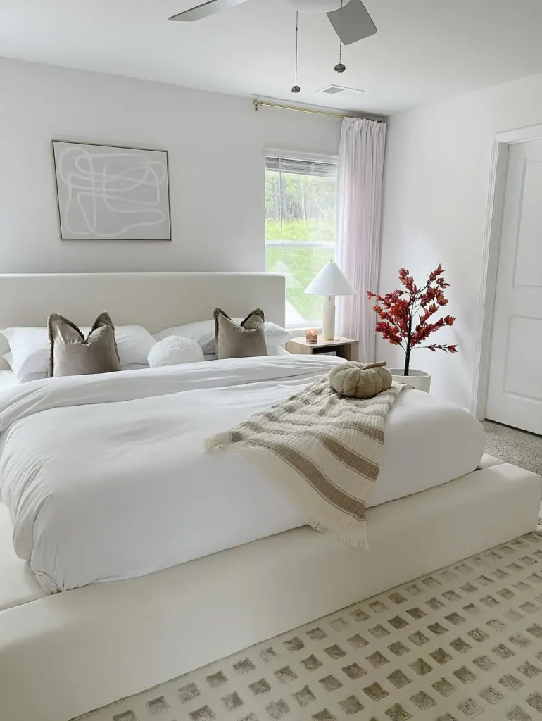 اینجا هر چیز کاربرد داره: از تختِ دارای فضای ذخیرهسازی تا پتوهای لایهلایه که بافت و گرما میآرن. ترکیب سفید و تناژهای گرم باعث میشه فضا روشن و دعوتکننده بمونه.