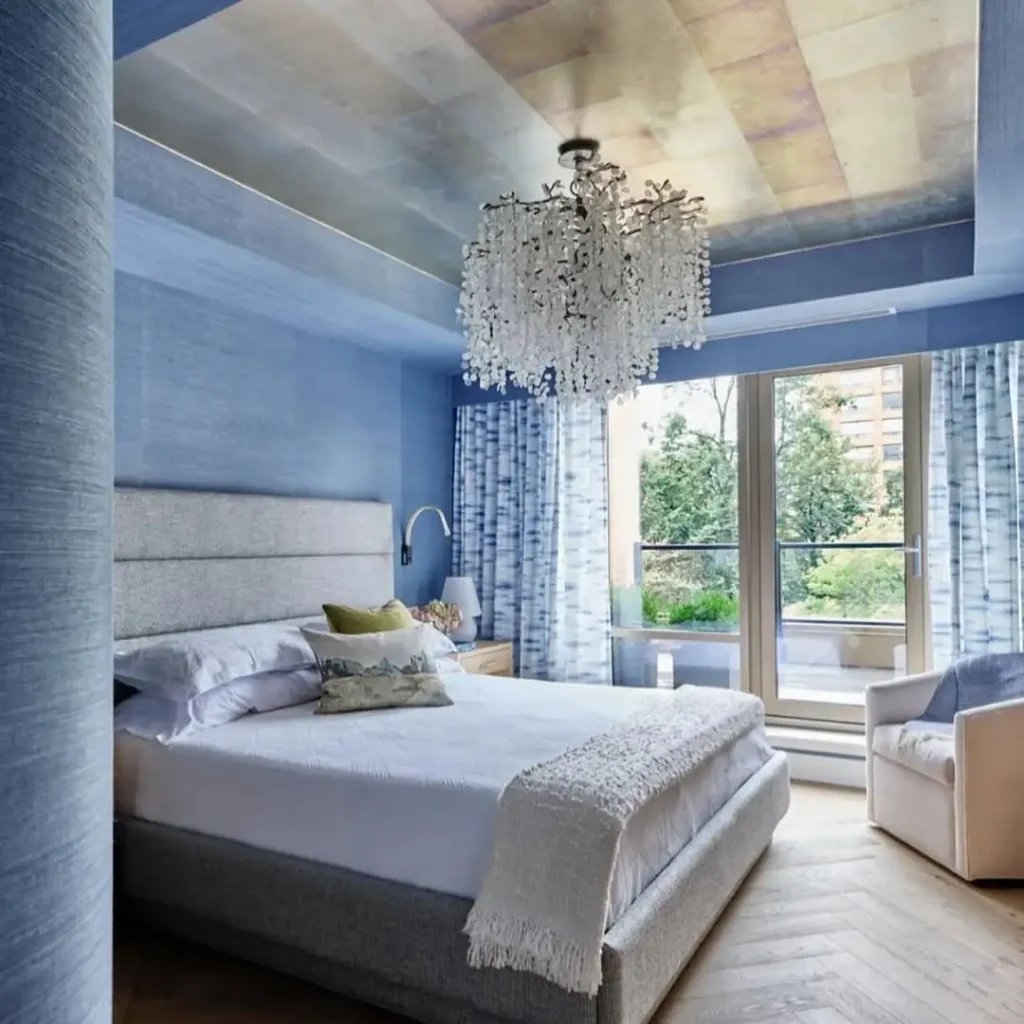 جسور اما آرام. این اتاق آبی تیره، تو رو توی رنگ و نور میپیچه. دیوارها، پردهها و سقف همرنگ شدن تا یک حس “پیلهای” بسازن که هم دراماتیکه، هم خیلی دنج. لوستر هم مثل یک ذره برقِ گلامور بالای همهچیز نشسته.