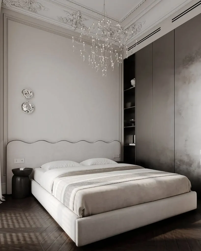 تاج تخت بلند باعث میشود اتاق از نظر بصری کشیدهتر دیده شود، و آینهها و لوستر مجسمهطور هم بدون اینکه شلوغ کنند، کمی گلامور اضافه میکنند. حتی فرش نرم هم آن حس ابری را تقویت کرده.