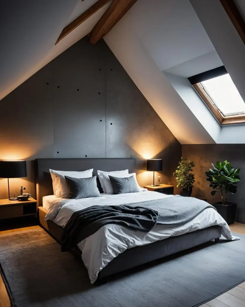 این اتاق زیرشیروانی تماماً روی “فضا” بازی میکند. دیوارهای خاکستری تیره، تیرهای نمایان و نور ملایم، اتاق را تبدیل کرده به یک پناهگاه پیلهای، دقیقاً از آن مدلهایی که آدم دلش میخواهد زودتر بخوابد.
