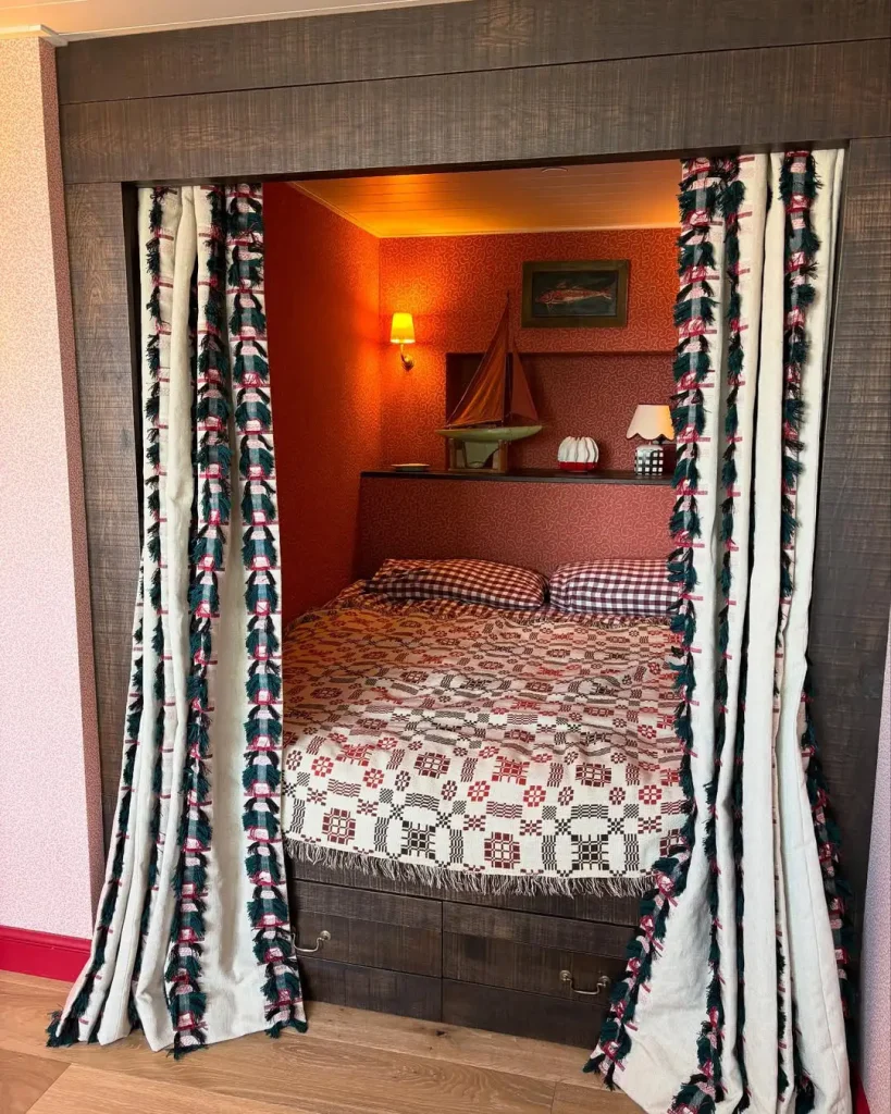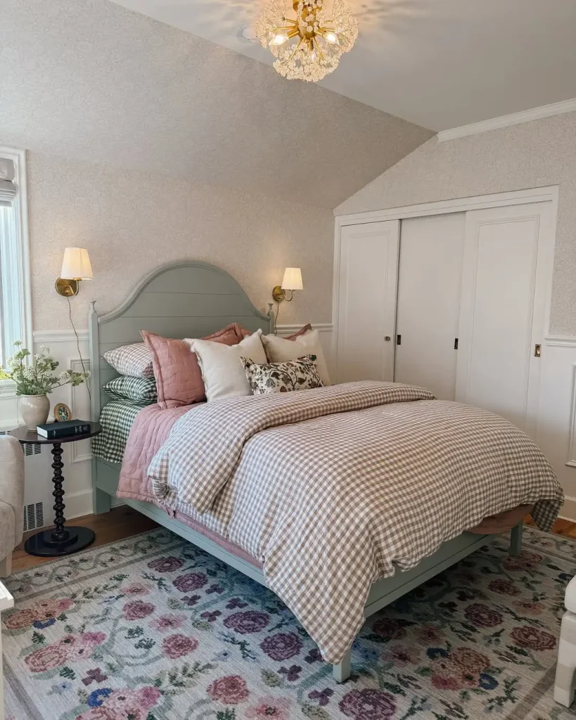 این یکی مثل یک صحنه از کتاب قصه است. رنگهای پاستلی نرم، فرش گلدار، و روتختی چهارخونه، یک ترکیب نوستالژیک و دوستداشتنی ساخته: بامزه، گرم و پر از شخصیت.