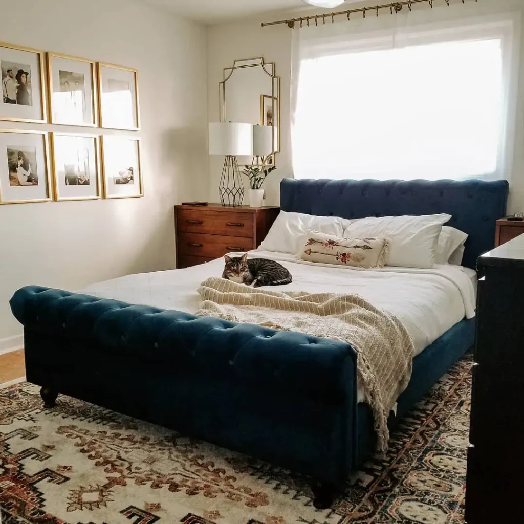 دیوار گالری بالای دراور، نگاه را بالا میکشد و اتاق را بلندتر نشان میدهد، فرش وینتیج هم رنگ و بافت را به زمین وصل میکند. و بله، گربه هم رسماً مهر تایید زده.