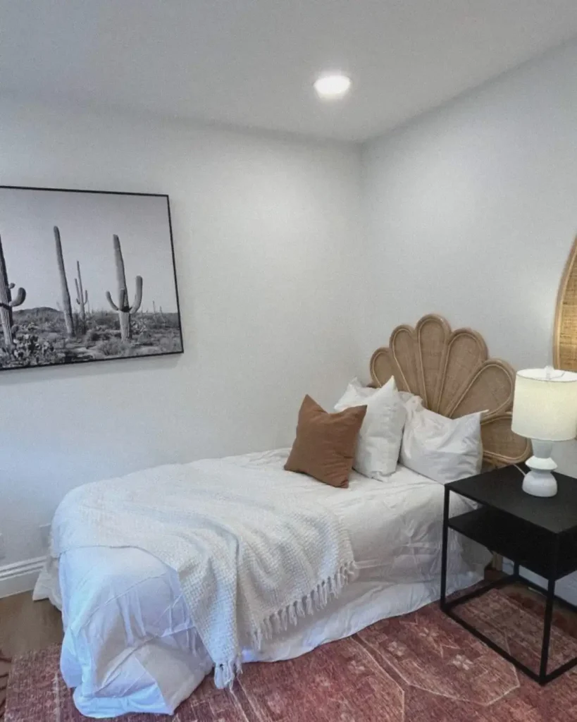 گرم، زمینی و خیلی سادهی قشنگ. این اتاق یک انرژی “غروب بیابان” دارد. تاج تخت حصیری یک فرم طبیعی و مجسمهطور میدهد و تابلو کاکتوس هم داستان را کامل میکند.