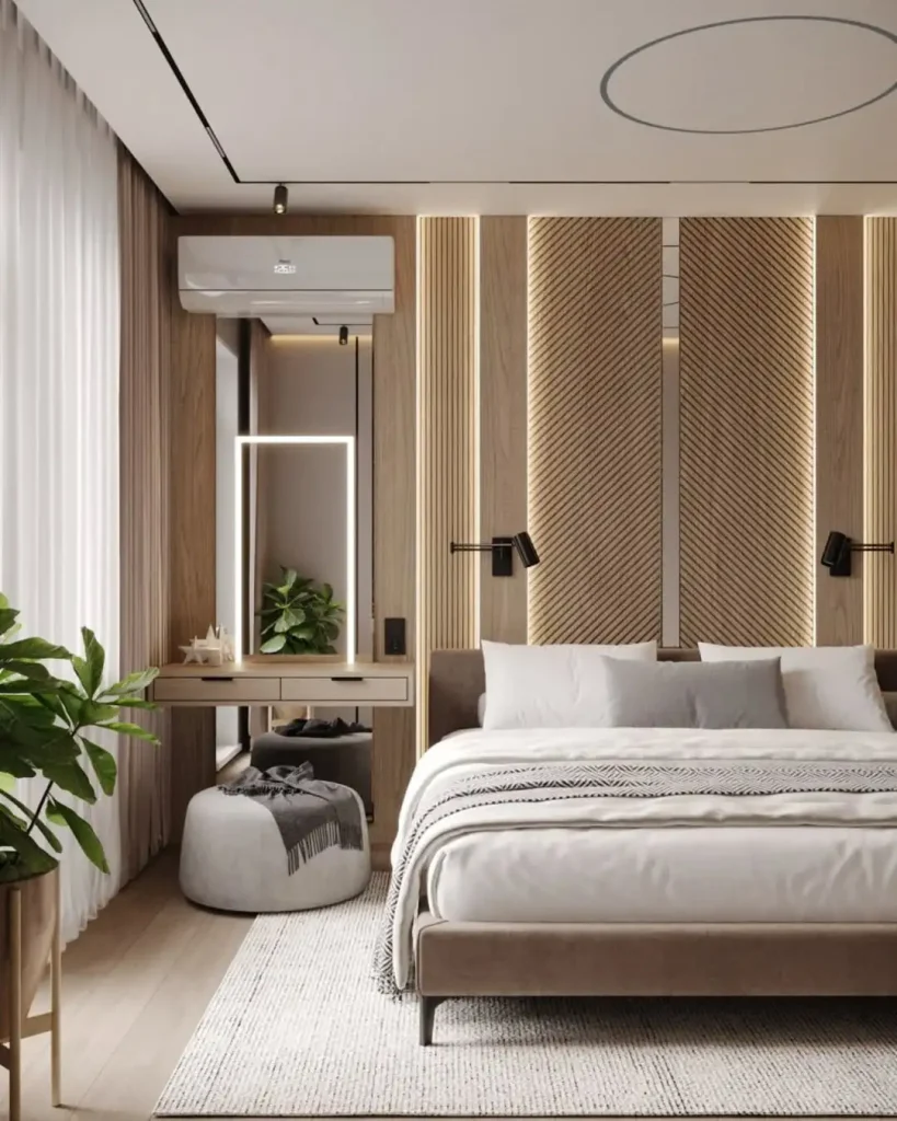 این طراحی ثابت میکند سادگی میتواند حس گرونی هم بدهد. پالت خنثی نرم، نورپردازی شیک و بافتهای لایهای، اتاق را بیتلاش “لوکس” نشان میدهد. ترکیب چوب، بژ و طوسی-قهوهای روشن، گرما را میآورد بدون اینکه شلوغ شود.