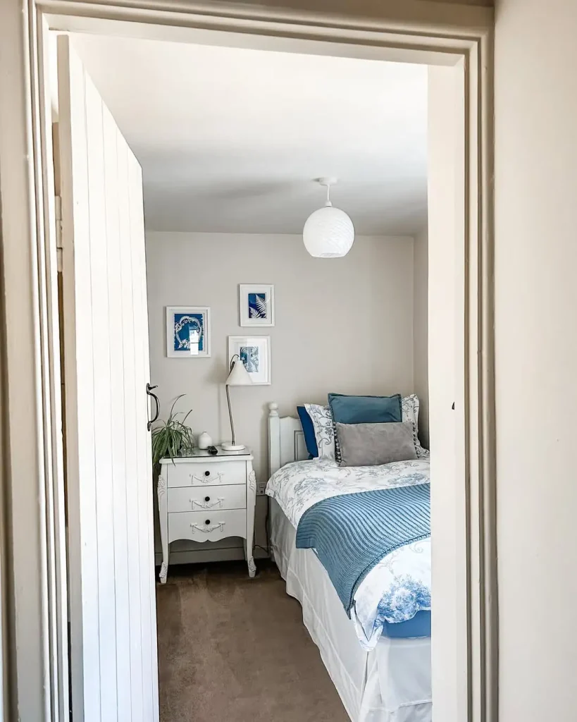سفیدهای تازه و آبیهای خنک، این اتاق کوچیک رو زنده کرده. روتختی تمیز و مبلمان رنگشده، آن جذابیت کلبهایِ دوستداشتنی رو میده: سبک، روشن و پر از شخصیت.
