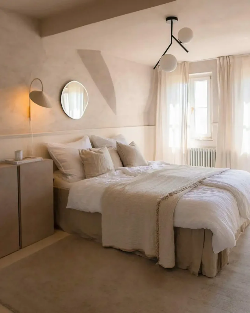 رنگها راحت و چشمنوازند: سفید، کرم، بژ و کمی خاکی که باعث میشود اتاق سبک و خلوت بماند. همان لحظهای است که وارد میشوی و ذهنت صاف میشود.