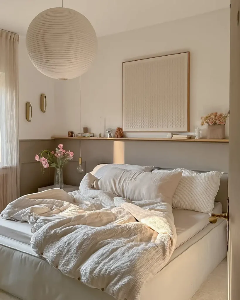 نور نرم خورشید، خنثیهای دنج و آن چراغ آویز کاغذیِ بزرگ و رویایی… این اتاق کوچیکه، ولی “مود” داره. طبقه شناور پشت تخت هم هم دکور حساب میشه هم کاربرد، یعنی هم جا میده هم فضا رو نمیبلعه.