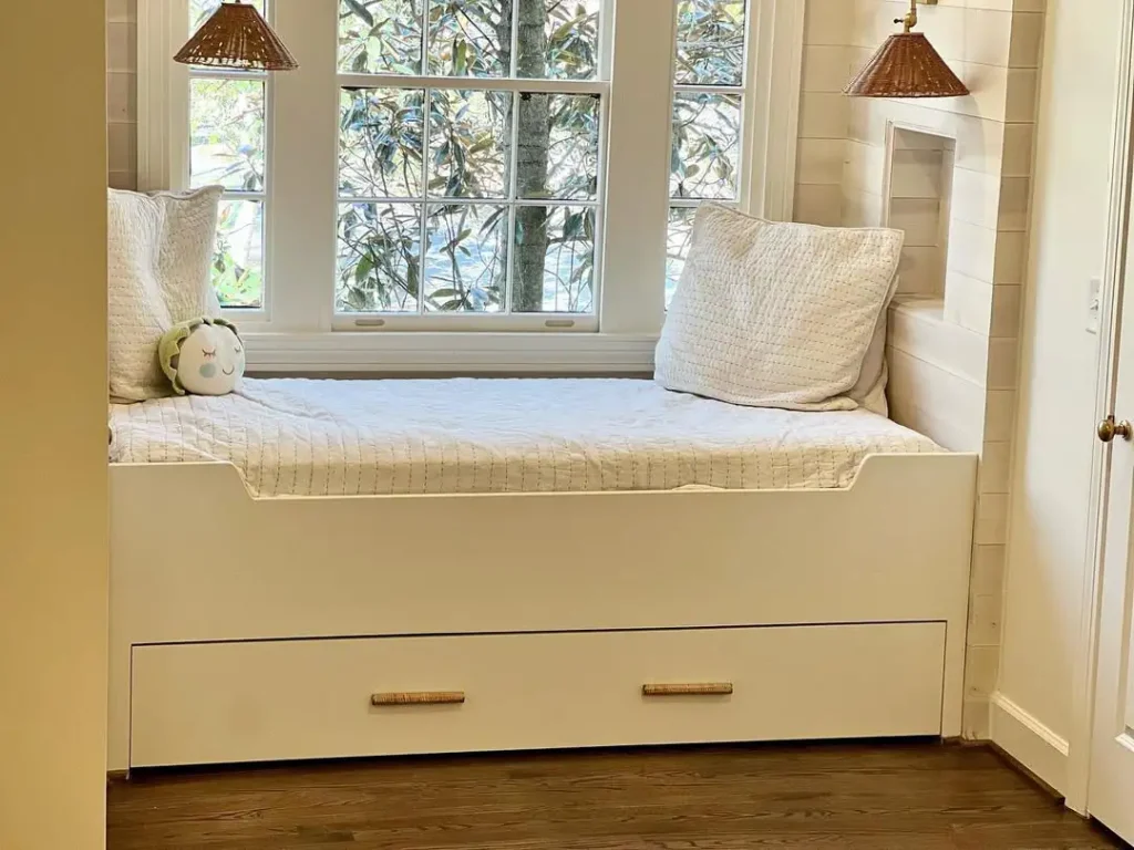 این یکی واقعاً شاهکاره: هم محل نشستن و دنجِ کنار پنجرهست، هم تخت کشویی برای خواب مهمون. رنگهای روشن و فضای سفید باعث شده اتاق آروم و دلباز بمونه و پنجره هم تبدیل به نقطه طلایی اتاق بشه.