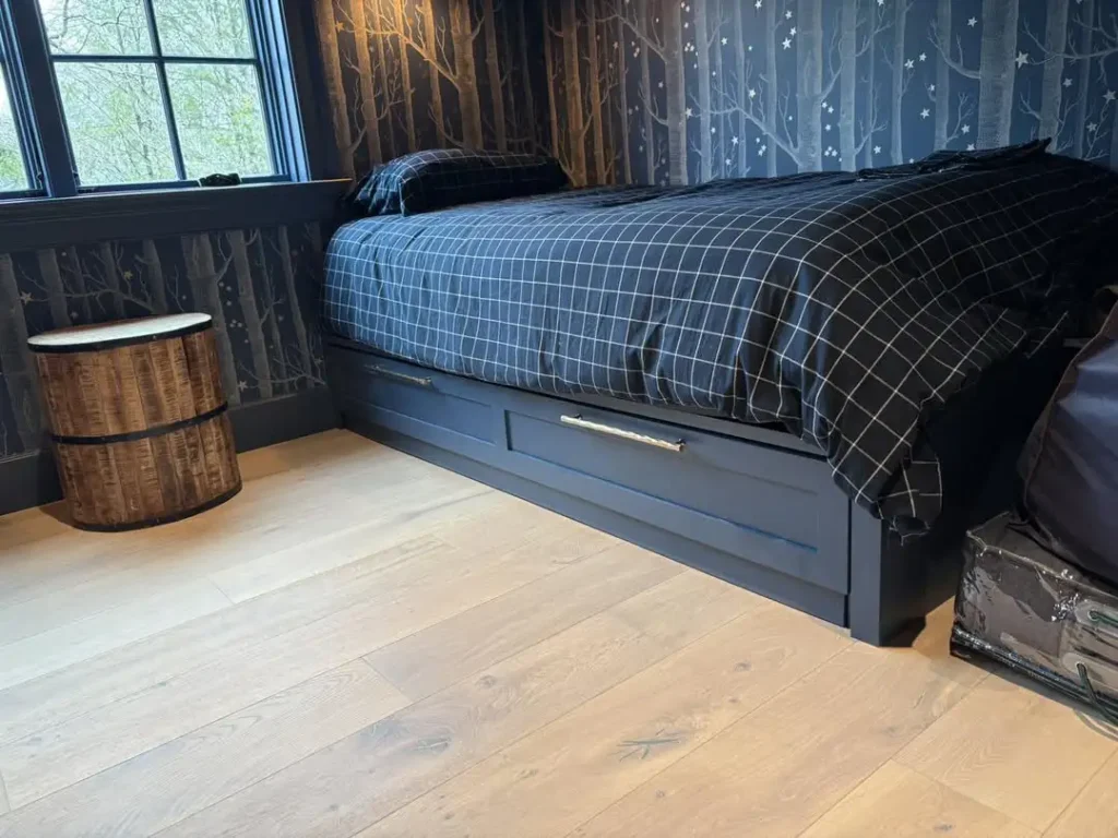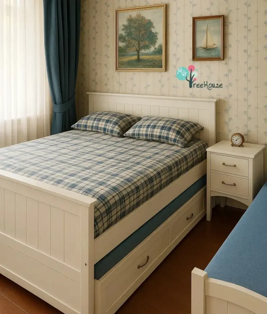 پتوهای چهارخونه، چوب کرمی و نور طلایی… این یکی یک حس نوستالژیک و آروم داره، مثل اتاق مهمان یک ویلای ساحلی. تخت کشویی هم برای خواب مهمونی بهترین سورپرایزه.