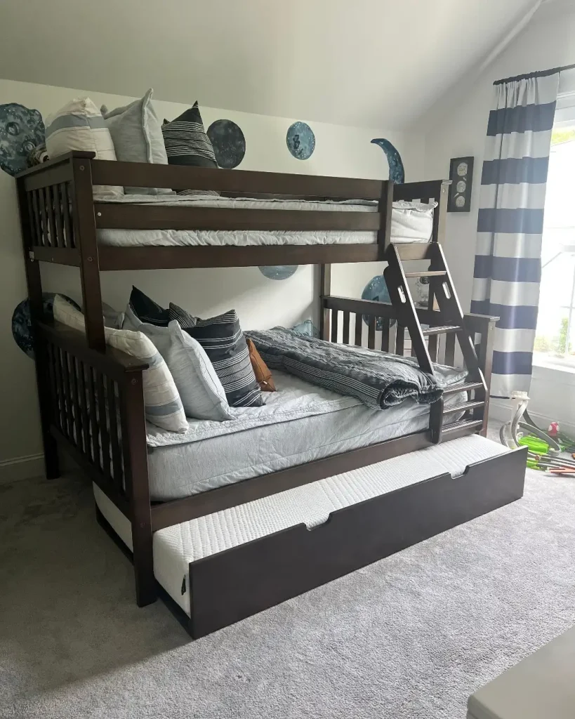 برای خواهر برادرها یا بچههایی که عاشق فضا و ستارهها هستن، این یکی خیلی میچسبه. چوب تیره با دیوارکوبهای ماه و تم طوسی-سفید، هم خنک و مدرنه هم بازیگوش.