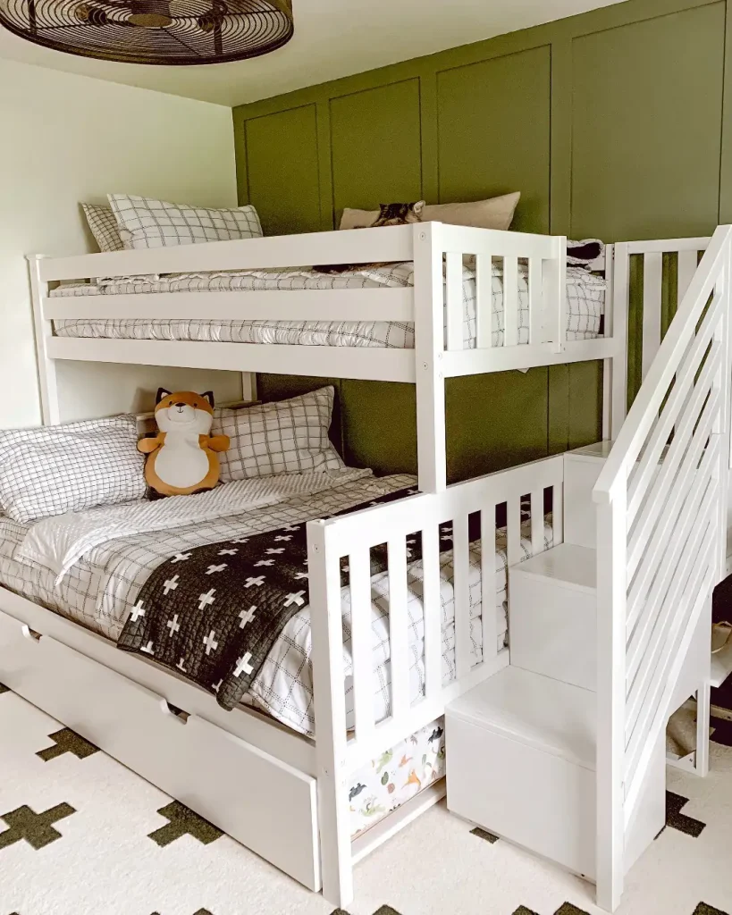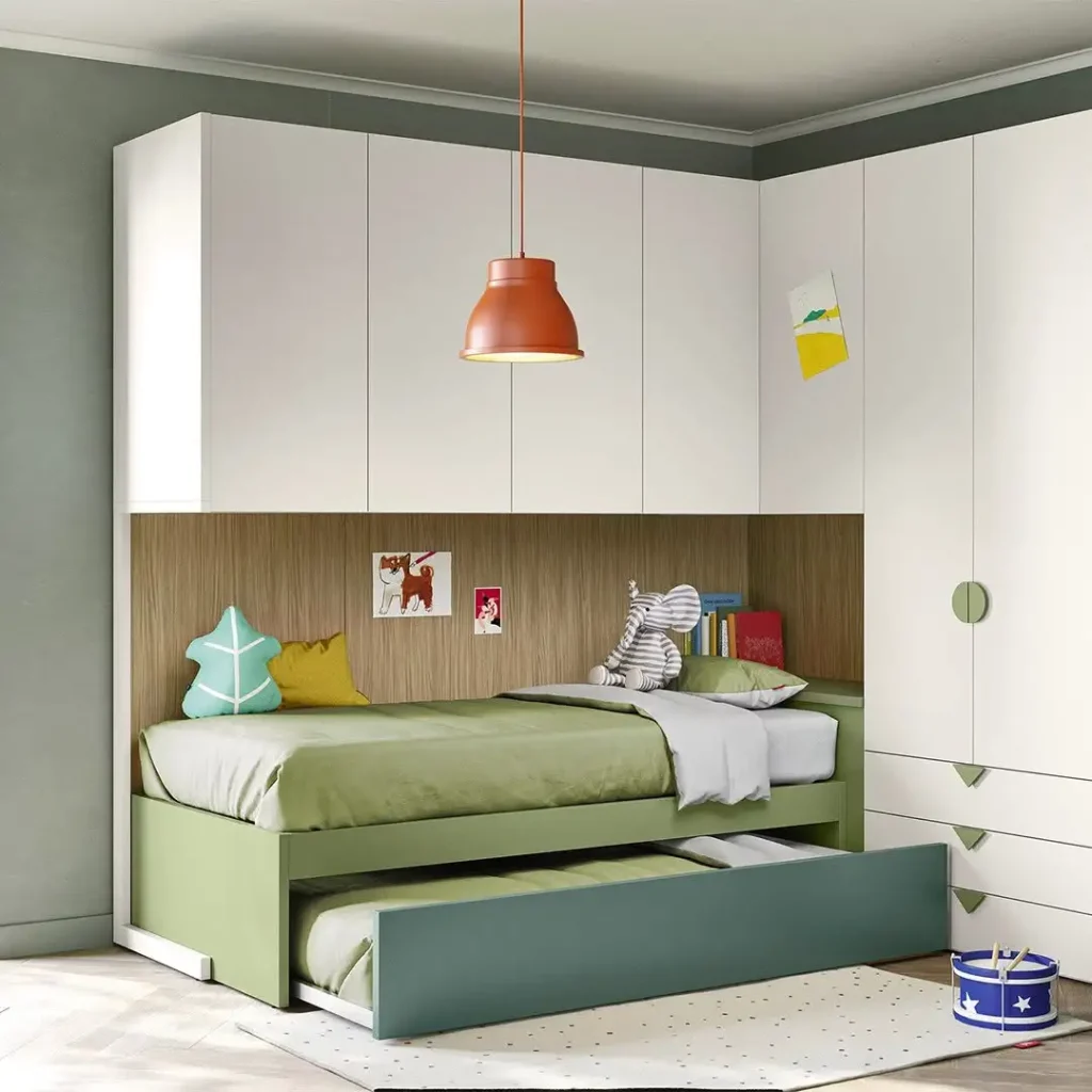 این مدل برای زیرشیروانی یا فضاهای کوچیک عالیه. چوب روشن با سبز ملایم و جزئیات بامزه، هم حس نوجوانانه/کودکانه داره هم آرومه.
