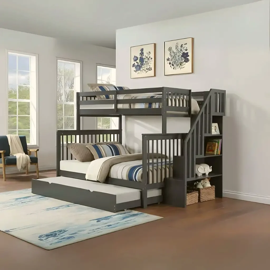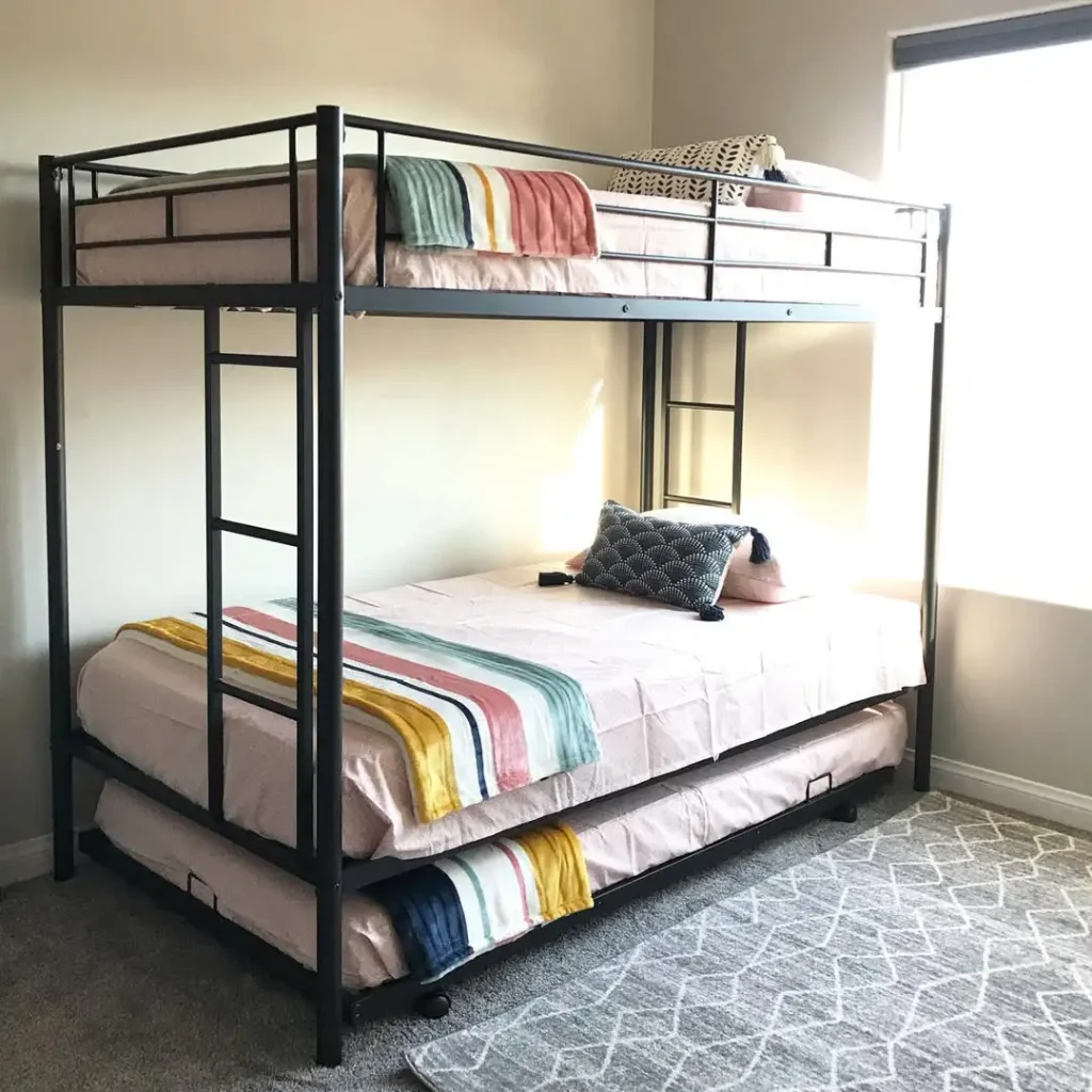 یک تخت دوطبقه، یک تخت پایین، و یک تخت کشویی. یعنی سه جای خواب با یک فریم جمعوجور. فریم فلزی مشکی هم باعث شده سبک و کمجا بمونه و برای اتاقهای کوچک عالی باشه.
