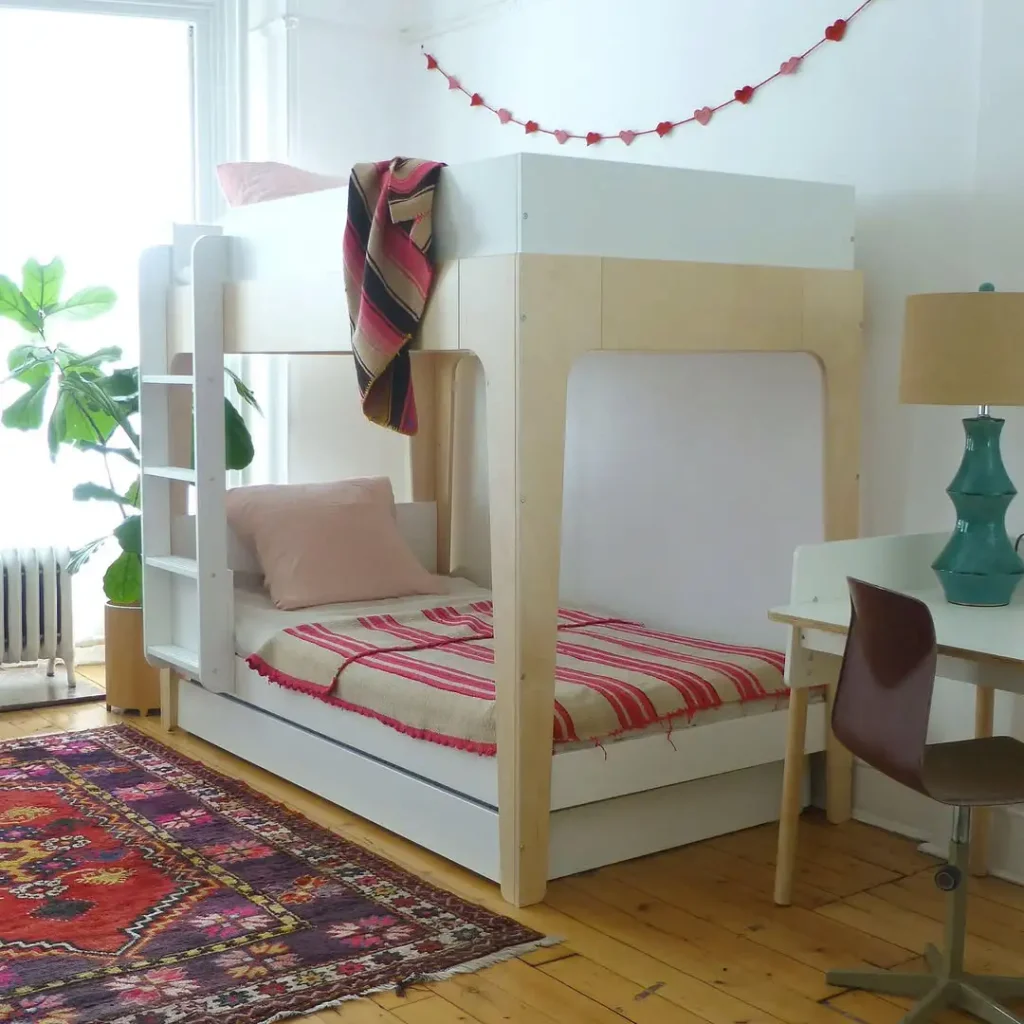 چوب روشن، رنگهای شاد و کلی فضا… دقیقاً همون چیزی که اتاق بچه باید داشته باشه. این مدل دوطبقه با تخت کشویی هم سبک و دلبازه، هم بازیگوش و بانمک. انحناهای طراحیش حس مدرنبودن میده و اون فرش طرحدار هم کل فضا رو میچسبونه به هم.