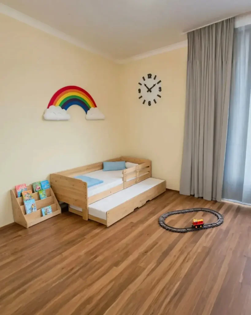 چوب طبیعی با خطهای ساده و گوشههای نرم، حس آرام و امن میده. با اون تم رنگی ملایم (آبیهای نرم) و دکورهای بازیگوش مثل رنگینکمان و اسباببازیها، فضا بچگانه میمونه ولی شلوغ نمیشه.