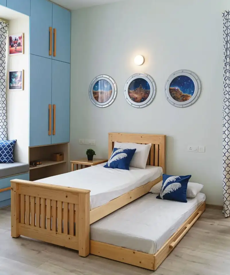 انگار از دل قصهها اومده. سقف آبی تیره شبیه آسمون شب، چوبهای گرم، و یک اتاق بچه که واقعاً حس «پناهگاه» میده. تخت کشویی هم بهترین گزینه برای شبهای مهمونی و خواب دوستهاست.