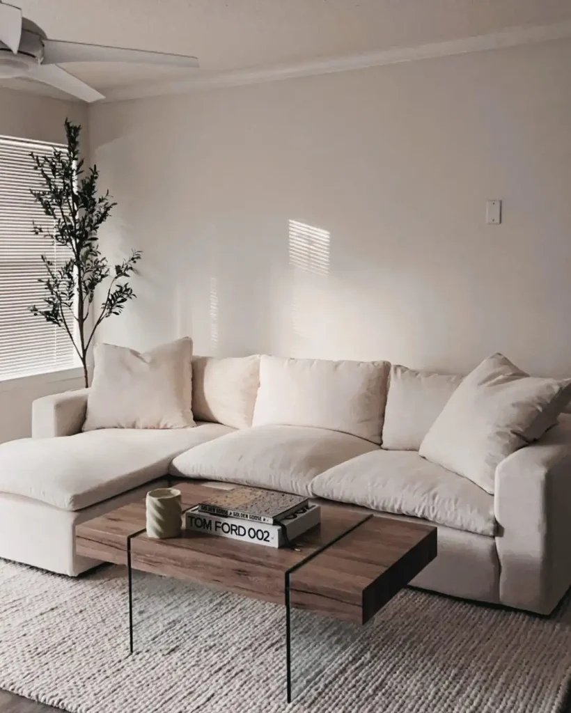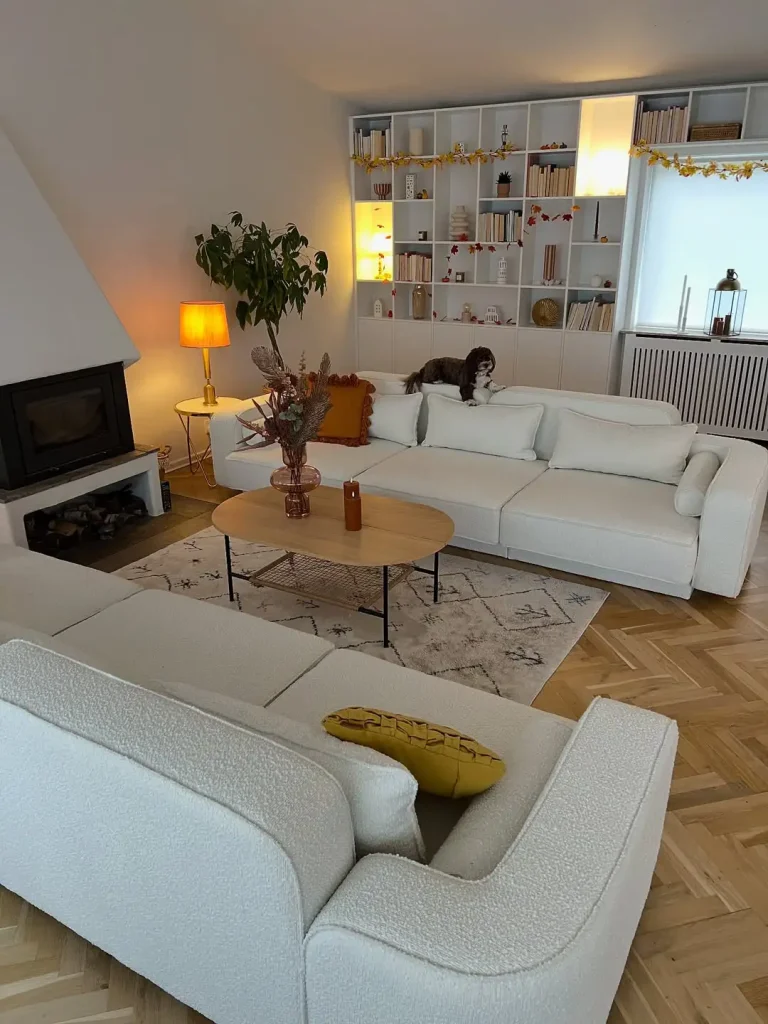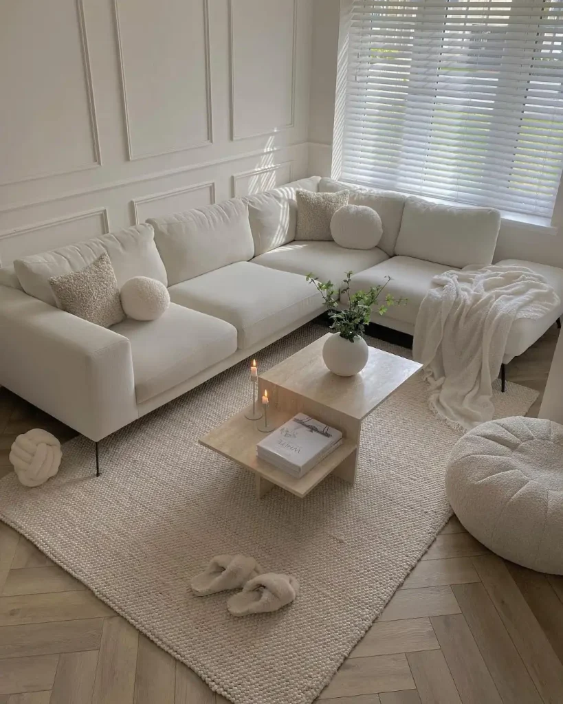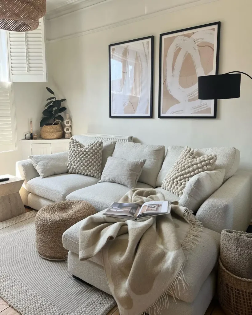 مبل سفید توی یک فضای گرم و نورِ نرم؟ بله لطفاً. این چیدمان حس بهترین آخر هفتهی پاییزی رو میده: نور آباژور، اکسسوریهای رنگ تیرهتر، و یک مبل الشکل پفدار که داد میزنه «بیا فرو برو توی من».