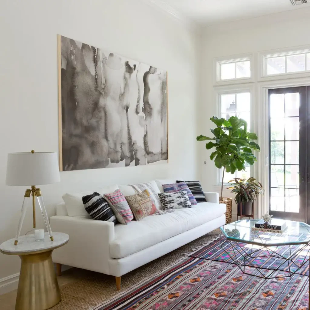 یک مبل سفید تمیز زیر یک تابلو بزرگ و نقاشیطور، فوری میگه این خانه خلاقه. پارچهها و فرش لایهلایه بافت میدن، بدون اینکه سادگیِ مبل رو خراب کنن.