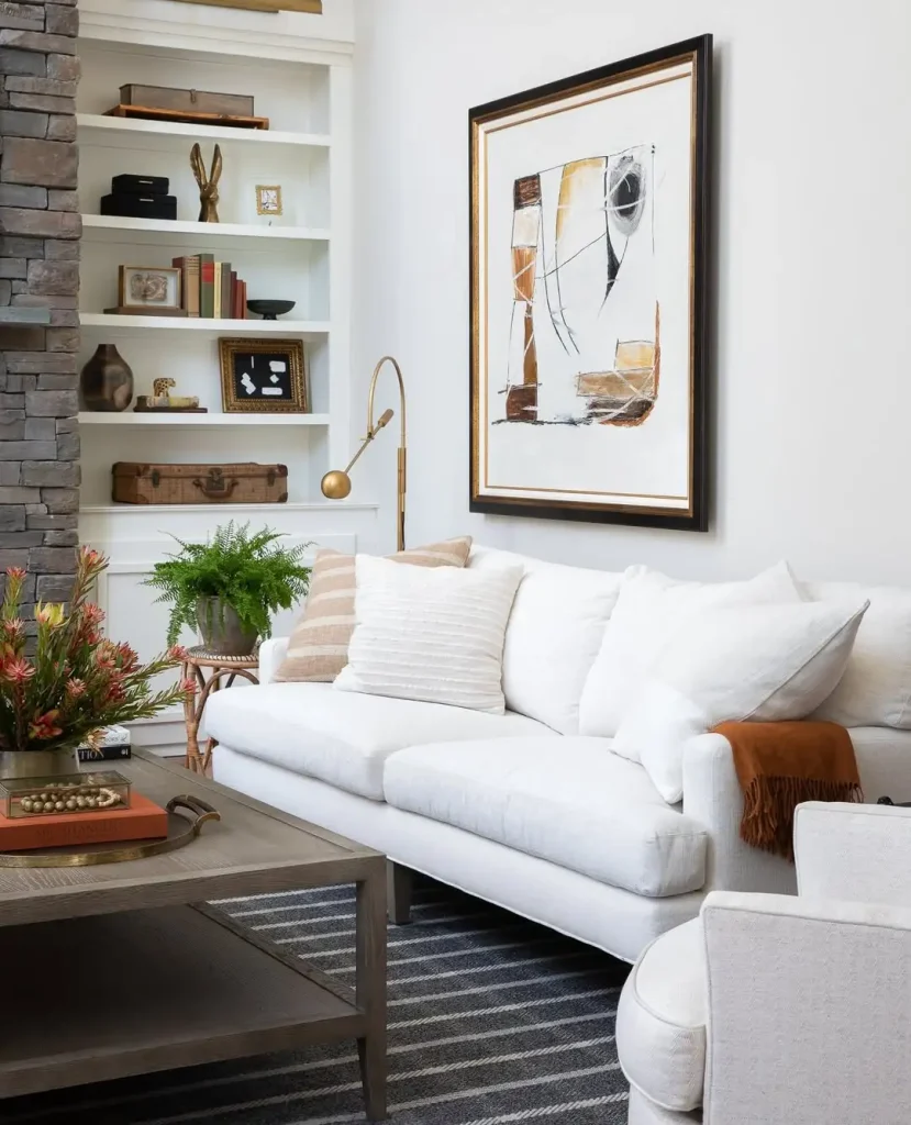 این اتاق دقیقاً تعادل بین «مرتب» و «دعوتکننده» رو گرفته. مبل سفید روشن پایهی فضاست و یک پسزمینهی تمیز برای چوبهای گرم، خنثیهای نرم و اون تابلو انتزاعیِ خاکی بالای مبل میسازه. کوسنها هم فرمدار و نرمان، طوری که کل فضا حس یک بعدازظهر ساکت و آرام رو میده.