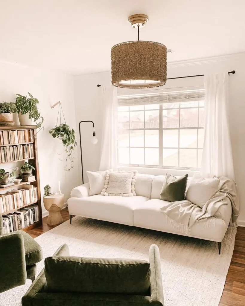 مبل سفید توی فضای کلبهایِ آفتابخورده همیشه خوب میشینه، اما این یکی واقعاً میدرخشه. سبزیِ گیاهها، بافتهای گرم و چراغهای حصیری، تعادل قشنگی بین «سبک» و «زمینگیر» میسازه.