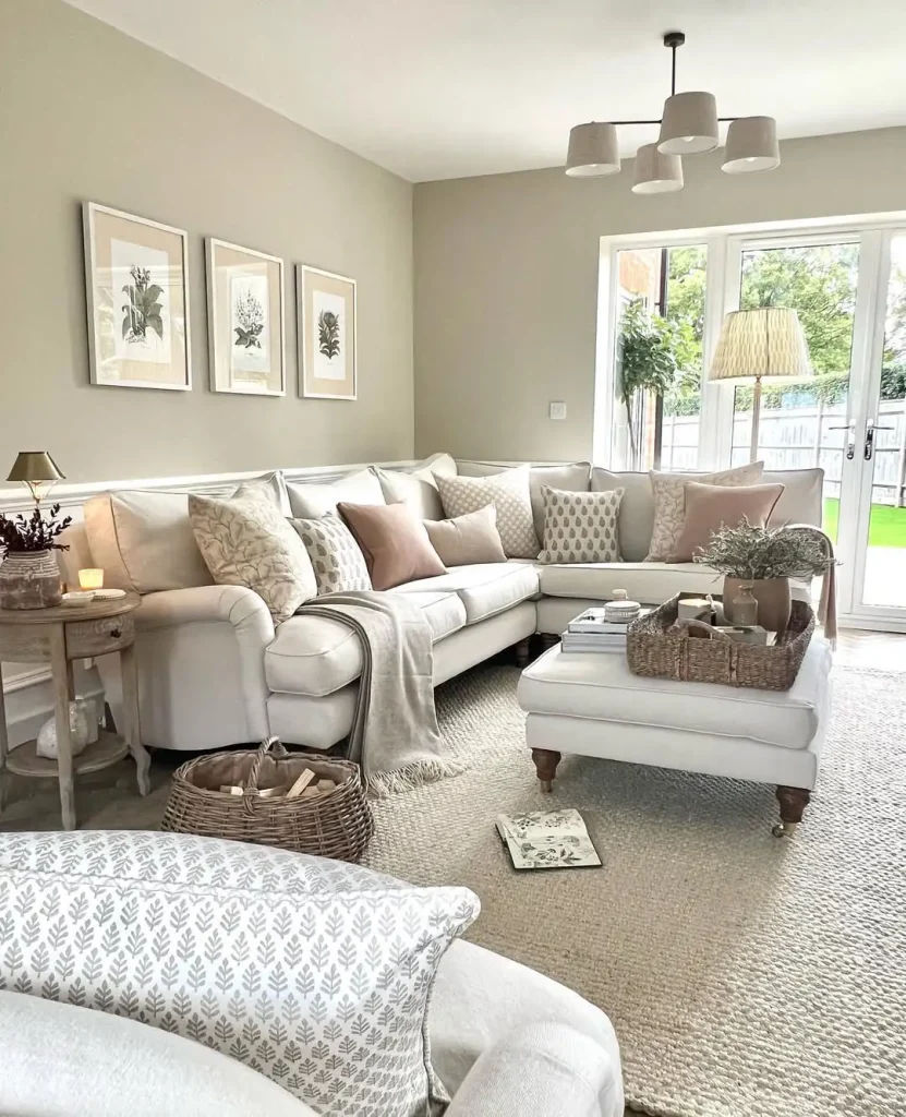 این فضا مثل یک بغلِ نرم میمونه. مبل الشکل سفید خیلی راحت کنار چوبهای گرم، بافتهای کرمی و دکور خاکی میشینه و همون حالوهوای معروف «خونهی خنثی ولی سطح بالا» رو میسازه. لایهها به اندازهان: نه خالی، نه شلوغ.