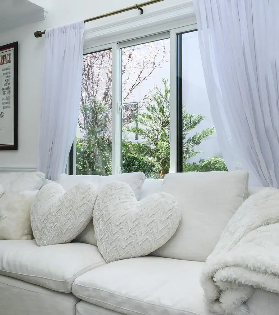 این گوشه ثابت میکنه سفید روی سفید هم میتونه گرم و عاشقانه باشه. کوسنهای قلبی یک ذره شیرینی به فضا میدن و پردههای نرم هم منظرهی باغ رو قاب میگیرن بدون اینکه ازش بدزدن.