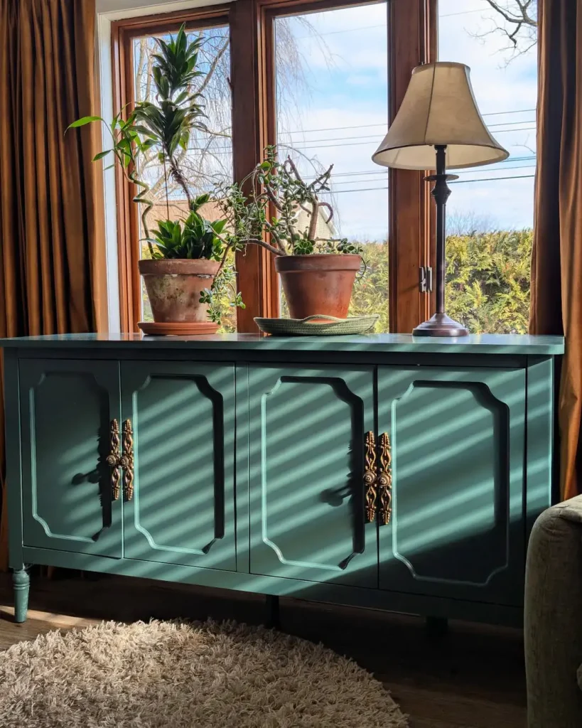 این یکی تماماً دربارهی کنتراسته. نور خورشید از پنجرههای چوبیقاب میریزه تو و روی کنسول سبزآبی تیره میخوره، و سایهی گیاهها مثل یک طبیعت بیجانِ نقاشیشده میافته روی دیوار و زمین.