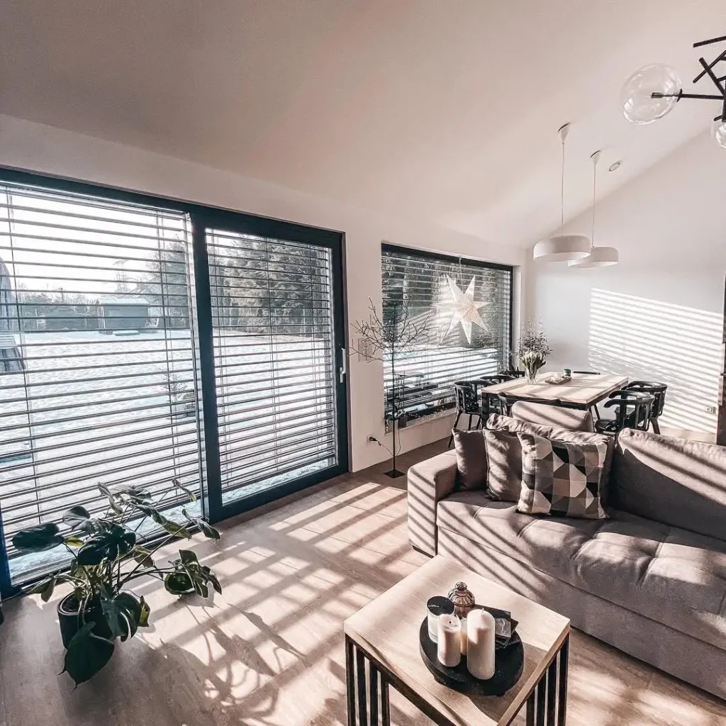 نور از بین کرکرههای افقیِ ساده میتابه و روی کف چوبی روشن، خطهای نرم درست میکنه. فضا تیز و مدرن به نظر میاد، ولی رنگهای بژ و چندتا جزئیات زمستونی مثل ستارهی روشن تو پنجره، یک آرامش جشنطور بهش میده.