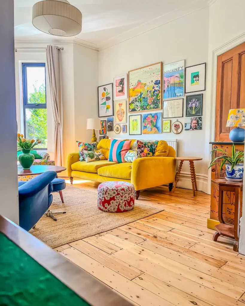 این اتاق مثل «سرم شادی» عمل میکنه. یک مبل لیمویی با کلی طرحهای شاد و جسور؟ بله لطفاً. دیوار گالری بالای مبل هم انگار انفجارِ شخصیته؛ هیچ چیز دقیقاً مثل هم نیست و همین جذابش کرده.