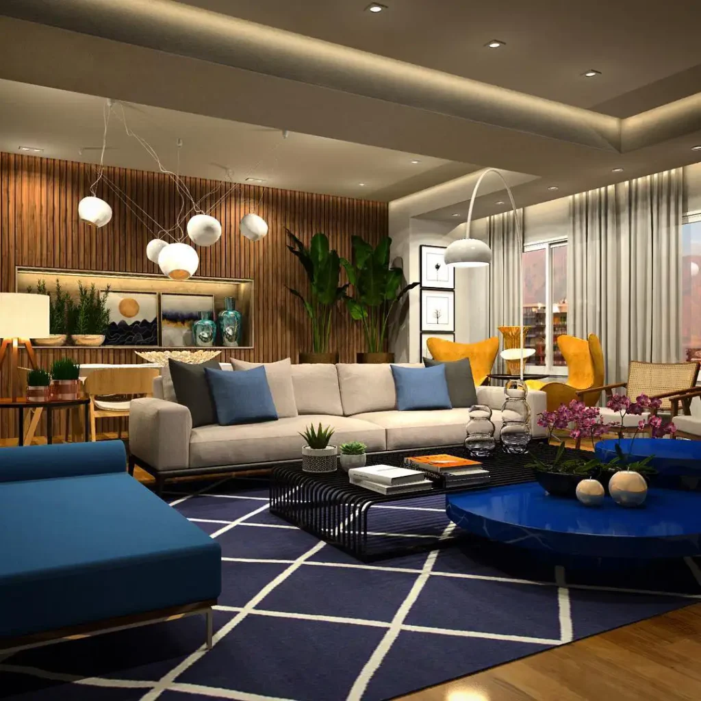 اینجا رنگبلوکی بزرگ شده! آبی سلطنتی با زرد آفتابگردونی خیلی جسورانهست، اما خطوط تمیز و فرش خنثی نمیذارن فضا از کنترل خارج بشه.
