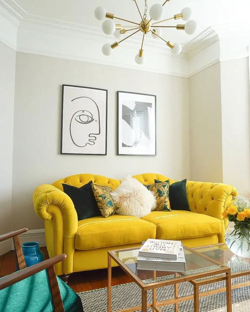 با کوسن، پرده، تابلو، گلدان، اکسسوریهای طلایی/برنجی، یا حتی یک صندلی تک. همینها هم اثر زرد رو میدن بدون ریسک زیاد.