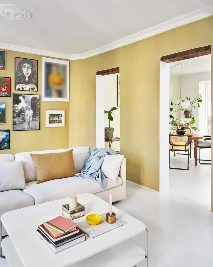 این زرد، با نجوا میاد نه با داد. دیوارهای زرد خردلیِ روشن مثل بوم عمل میکنن تا هنر مدرن و قاببندیِ گالریطور خودشون رو نشون بدن. فضا رهاست ولی حسابشده، مخصوصاً با بازیِ ظریف رنگهای خنثی، صورتی ملایم و آبی جین.