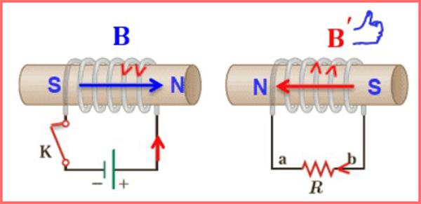 پاسخ: با باز کردن کلید شار مغناطیسی کاهش می یابد و میدان سیملولهها هم c جهت هم میشود. در نتیجه جریان در مقاومت R از a به b میباشد.