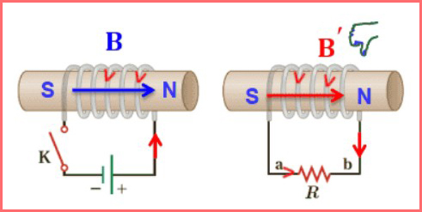 پاسخ: با بستن کلید شار مغناطیسی افزایش مییابد و میدان سیملولهها خلاف جهت هم میشود. در نتیجه جریان در مقاومت R از b به a میباشد.