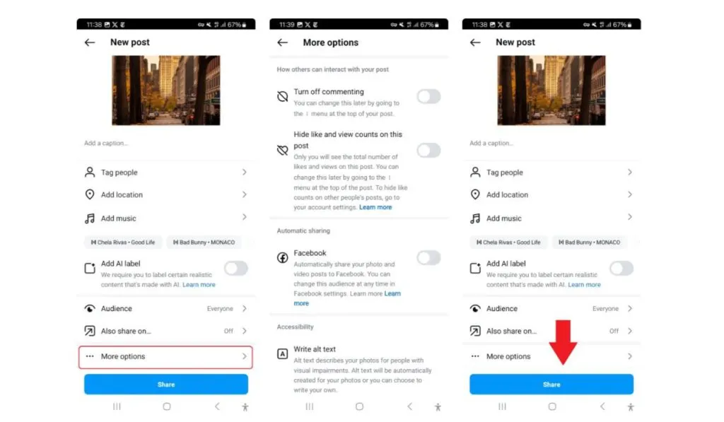 - بعد از انتخاب عکس یا ویدیو و نوشتن کپشن، روی گزینه More Options بزن